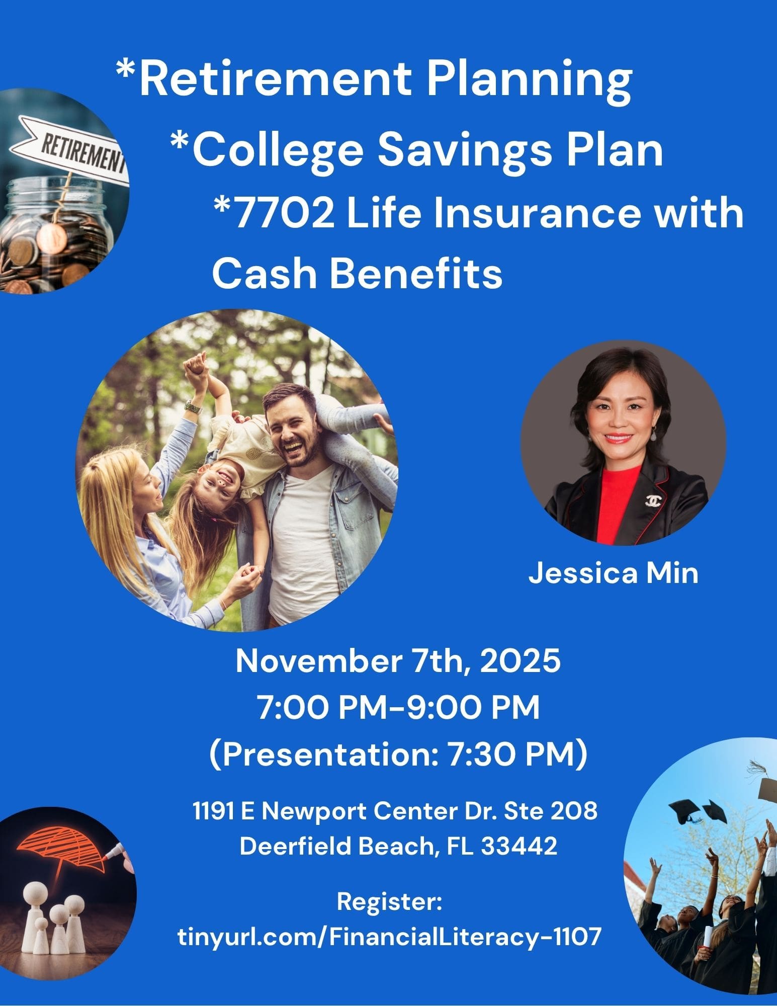 1191 E Newport Center Dr. Ste 208, Deerfield Beach, FL 33442 1191 E Newport Center Dr. Ste 208, Deerfield BeachJoin us for this in-person workshop where we will cover the topics listed below! Please register via this link: tinyurl.com/FinancialLiteracy-1107 1191 E Newport Center Drive Ste 208, Deerfield Beach FL 33442 Empower yourself to make informed and confident decisions about Retirement, College Savings and 7702. ✅ 1. Retirement ✅ 2. College Savings ✅ 3. 7702...